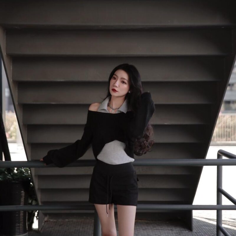 超厚實高領露肩毛衣套裝